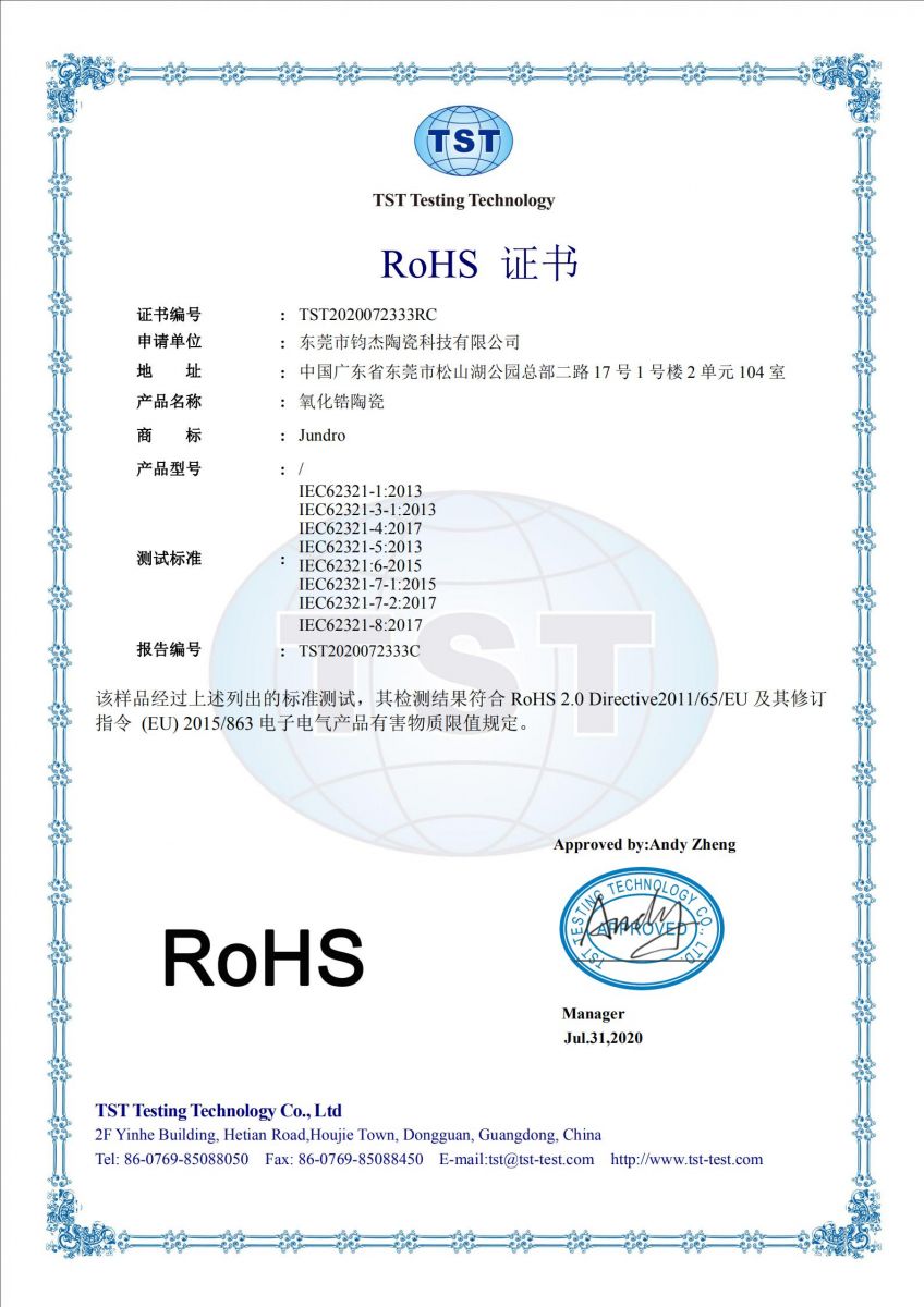 氧化鋯陶瓷ROHS證書