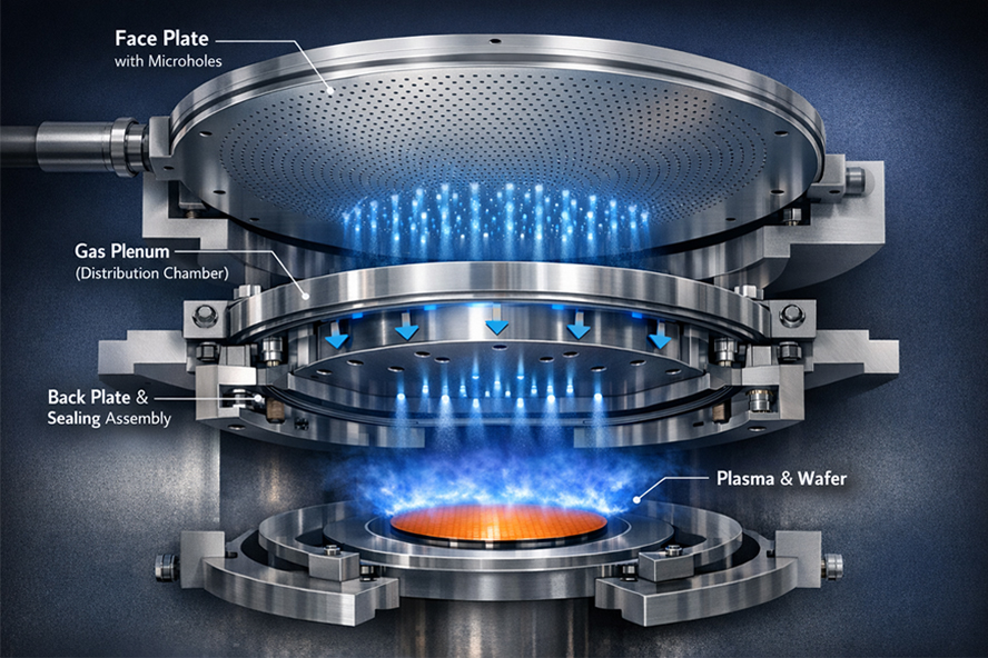 在干法刻蝕中,噴淋頭用于均勻?qū)肟涛g氣體(如氟基、氯基氣體)并形成均勻等離子體。其面對強腐蝕等離子體的耐久性,直接決定了刻蝕工藝的窗口寬度、側(cè)壁形貌的控制能力與機臺正常運行時間。