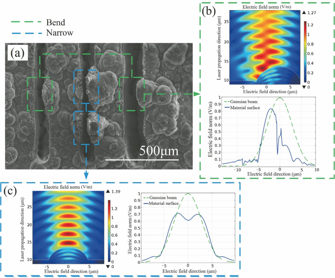 CMC-SiC主要由最外側(cè)的SiC層和內(nèi)部的SiC基體、纖維及界面層組成,在纖維編織結(jié)構(gòu)中還包含許多微小孔隙,復(fù)雜的材料結(jié)構(gòu)致使CMC-SiC在激光加工過(guò)程中會(huì)產(chǎn)生與一般均質(zhì)材料不同的物理和化學(xué)變化。在纖維增強(qiáng)復(fù)合材料與激光相互作用機(jī)理方面,國(guó)內(nèi)外學(xué)者基于理論與實(shí)驗(yàn)進(jìn)行了大量探索。吳恩啟等理論研究了碳纖維增強(qiáng)復(fù)合材料的熱傳導(dǎo)規(guī)律,推導(dǎo)出了復(fù)合材料內(nèi)部纖維束平面內(nèi)熱擴(kuò)散系數(shù)與相位梯度的關(guān)系。纖維編織復(fù)合材料具有各向異性的特點(diǎn),纖維束方向會(huì)直接影響熱傳導(dǎo)規(guī)律,且復(fù)合材料的熱擴(kuò)散系數(shù)與編織方式和基體材料分布相關(guān)。Allheily等研究了高能量激光對(duì)碳纖維增強(qiáng)復(fù)合材料的燒蝕機(jī)制,發(fā)現(xiàn)碳纖維增強(qiáng)復(fù)合材料對(duì)激光輻照產(chǎn)生的熱量具有很強(qiáng)的隔絕作用,主要原因在于碳纖維能夠承載并吸收熱量,層間基體材料的燒蝕可以有效降低激光能量的積累。Zhai等使用波動(dòng)光學(xué)仿真軟件分析了C/SiC原始表面粗糙度對(duì)激光加工效果的影響,仿真結(jié)果表明C/SiC原始表面形貌對(duì)激光刻蝕效果有顯著影響,激光輻照在C/SiC表面凸起的不同位置時(shí),電場(chǎng)會(huì)發(fā)生偏移或減弱,電場(chǎng)強(qiáng)度的不均勻分布導(dǎo)致C/SiC表面不同區(qū)域的刻蝕形貌存在差異,如圖2所示。