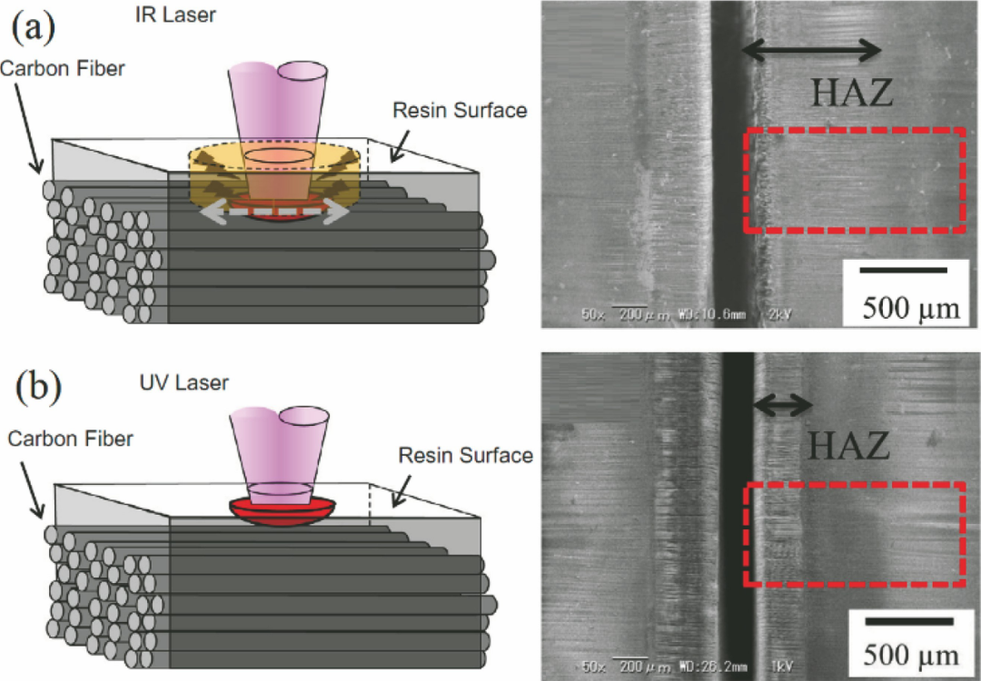 圖3 不同波長(zhǎng)激光對(duì)纖維增強(qiáng)材料的作用效果對(duì)比:(a)紅外激光;(b)紫外激光