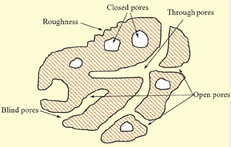 多孔陶瓷材料是含有大量孔隙的材料,由連續(xù)的固體相和形成孔隙的流體相所組成。如圖所示,其孔結(jié)構(gòu)可以分為閉孔和開孔結(jié)構(gòu)??梢钥吹?,閉孔為固體相所包圍,與外面流體介質(zhì)無連通。